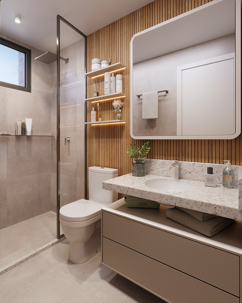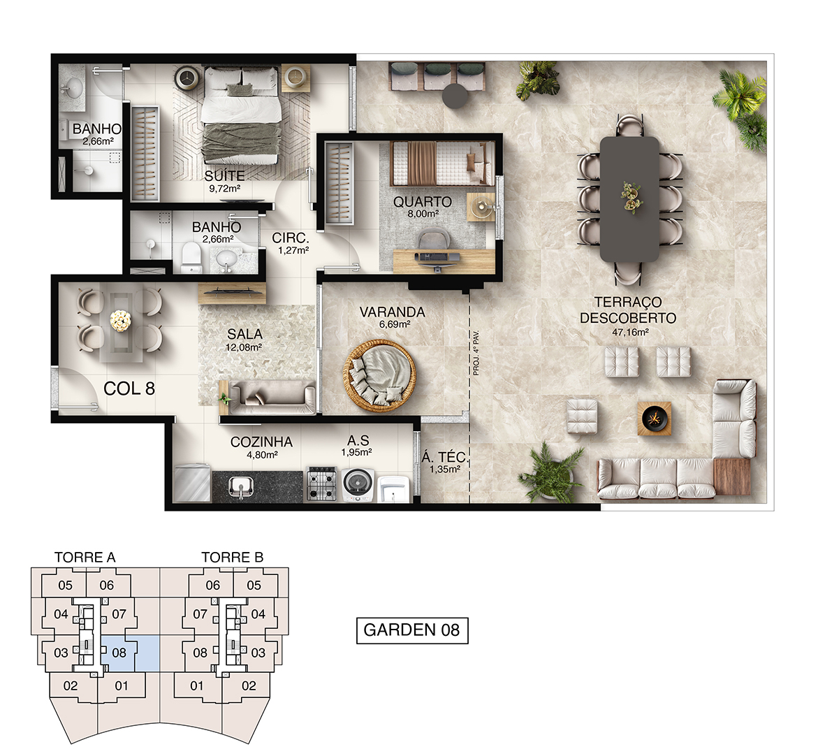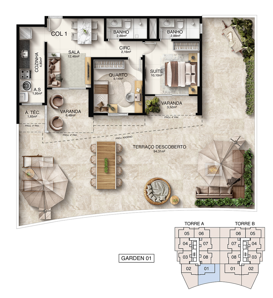O empreendimento é composto por dois blocos que agregam 44 apartamentos com área total interna de 93 m² até 219 m², 2 a 4 quartos e até 2 suítes. Os imóveis contam com plantas modernas e design refinado, e o condomínio agrega lazer, estacionamento, segurança e um espaço de galeria de arte.